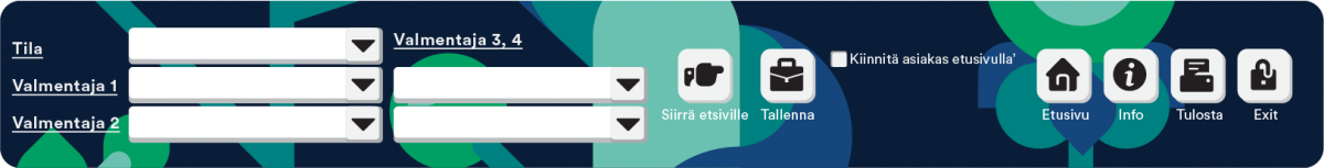 Työpajojen asiakaskirjaukset-ikkunan yläpalkkiin merkitään asiakkaan valmentajat ja tila. Vain ensimmäisen valmentajan nimi näkyy etusivun valintalistassa, loput asiakkaalle kirjatut valmentajat näkyvät etusivun vasemmassa laidassa Info-lehdellä. Oma asiakas löytyy etusivun listasta, kun työntekijä on kirjattu valmentajaksi johonkin neljästä pudotusvalikosta. Yläpalkin painikkeilla tallennetaan asiakas tietokantaan, voidaan siirtää asiakas työpajan ja etsivien yhteiseksi asiakkaaksi sekä ottaa asiakaskohtainen tuloste uuteen Exceliin. Yläpalkista näkee koko ajan kirjattavan asiakkaan etunimen ja sukunimen sekä voimassa olevan jakson aloitus- ja päättymispäivän. Lisäksi sieltä näkee kirjauksia tekevän työntekijän nimen.