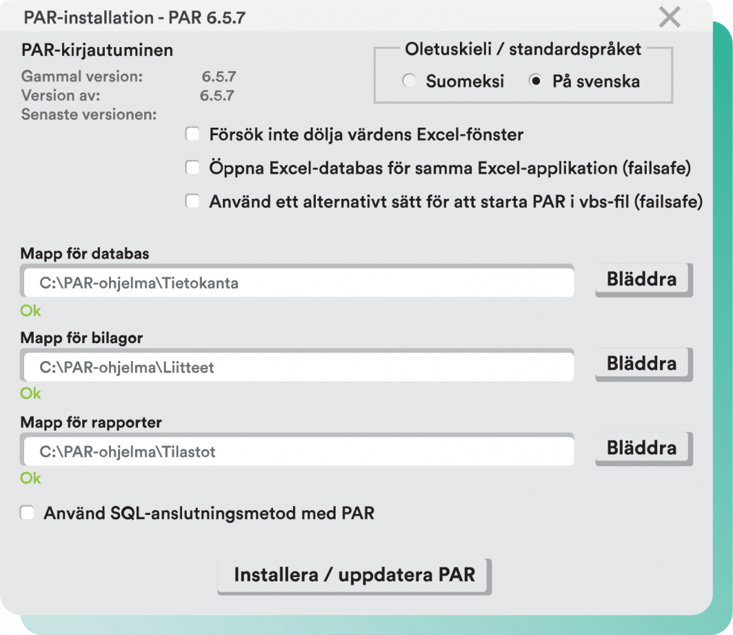 - Filkatalog för databasen: Filkatalogen Tietokanta innehåller filen PAR tietokanta v6.0.xlsb eller så måste SQL-anslutning användas.
