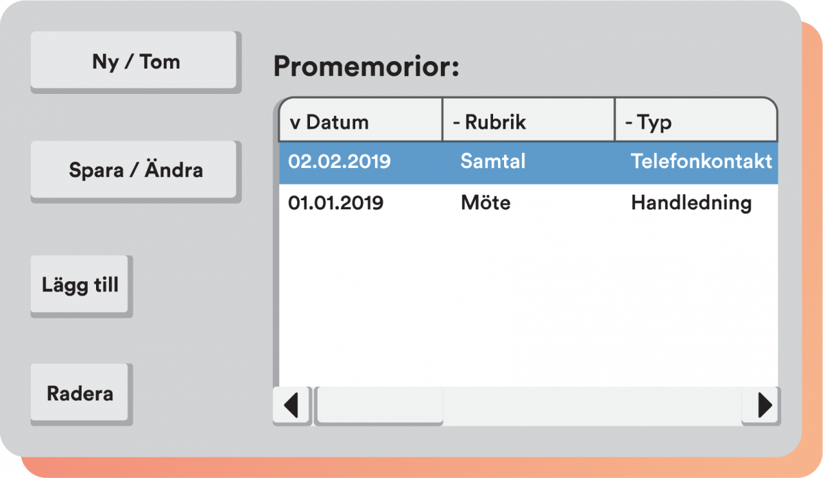 Olika sidor i systemet har listboxar som visar registreringar som rader i formuläret. Den äldsta uppgiften finns alltid på den sista raden i listboxen och den senaste uppgiften på den översta raden. Du kan hantera registreringar i listboxen med knapparna bredvid den. I samtliga urvalslistor går uppgifterna att filtrera A-Ö och Ö-A genom att klicka på rubrikerna.